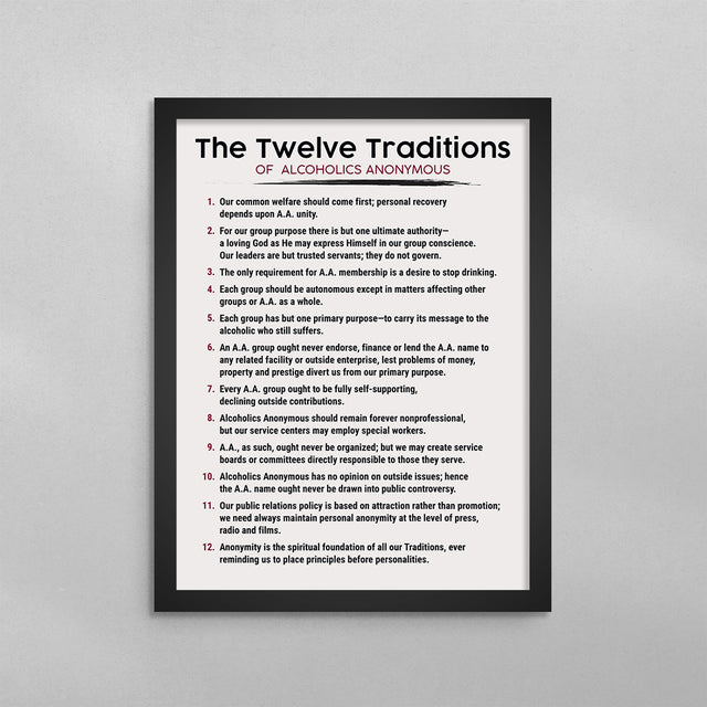 The 12 Traditions of Alcoholics Anonymous AA Poster, mental health therapy wall art for professionals perfect for your center, clinic, home or office. Shipped right to your door.